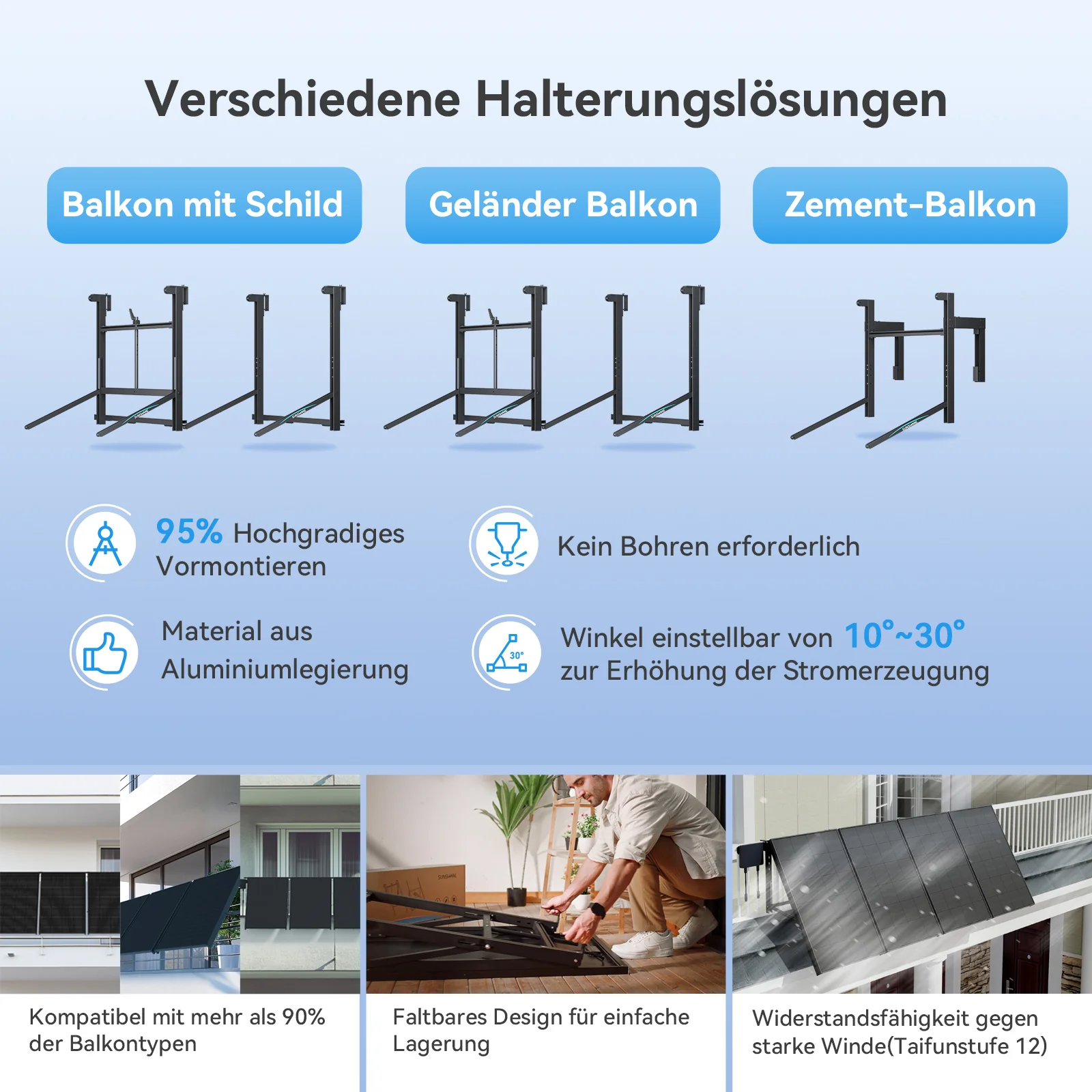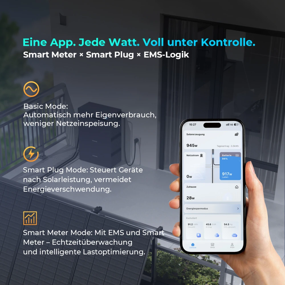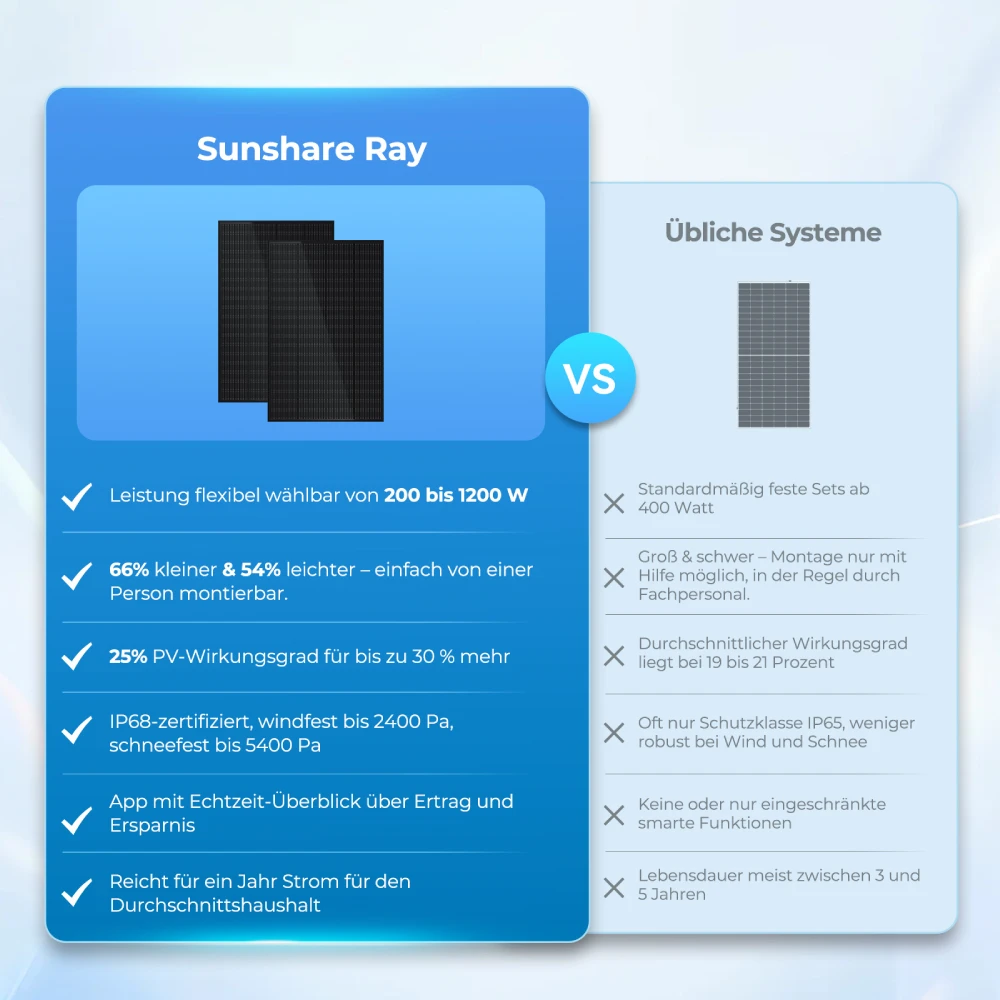 Die leichten, kompakten Module passen auf nahezu jeden Balkon und lassen sich flexibel platzieren.
